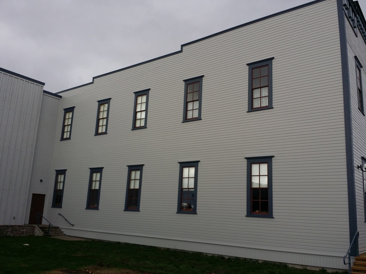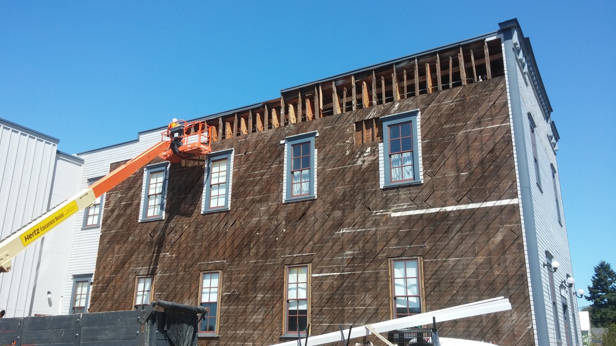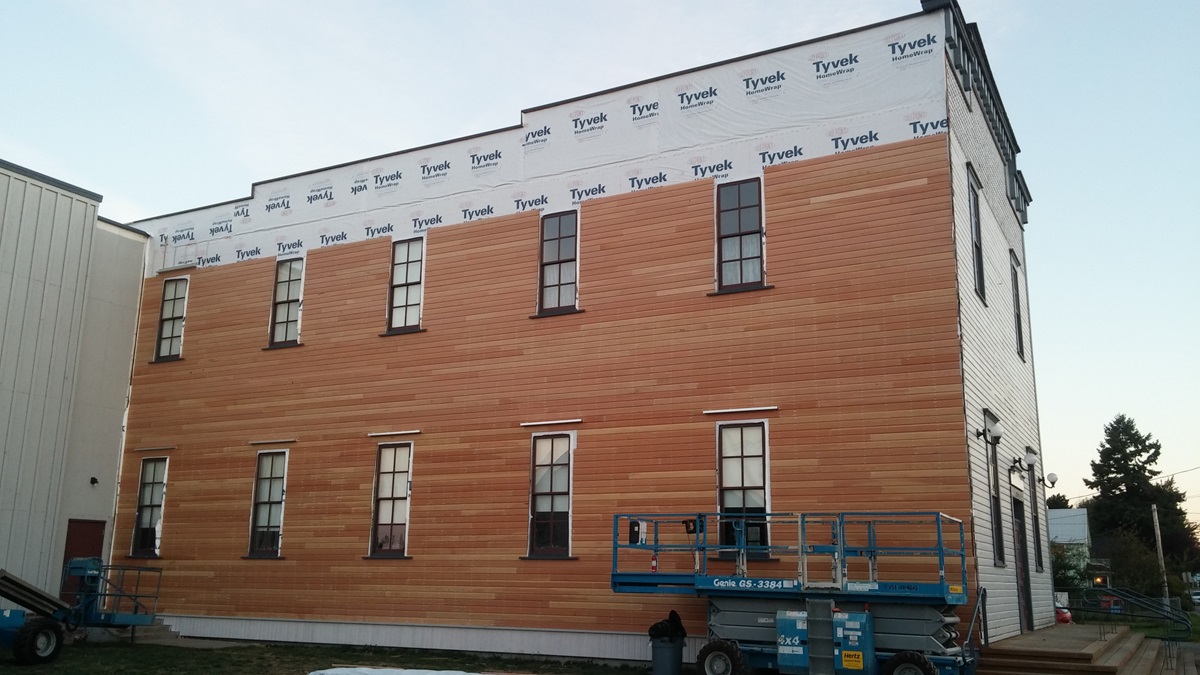 This project’s scope included removal of existing siding and window trims on the South face of the building. The new installation included new insulation, sheathing, Tyvek siding moisture barrier, clear vertical grain fir siding (to match existing siding profile), window head trims, and painting all new siding and trim to match existing finish.