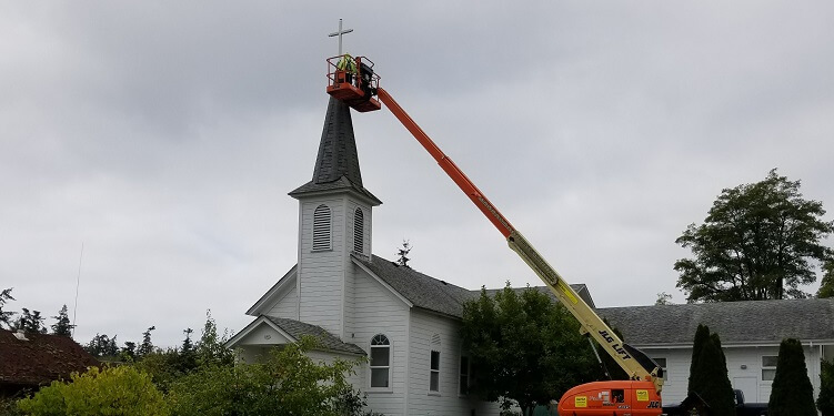 Last spring, the cross on St. Paul’s Catholic Church in La Conner was blown off by a big gust of wind. This fall Chad Fisher Construction installed a new cross, carved by Michael Pablo of the Tulalip Tribe in Marysville.